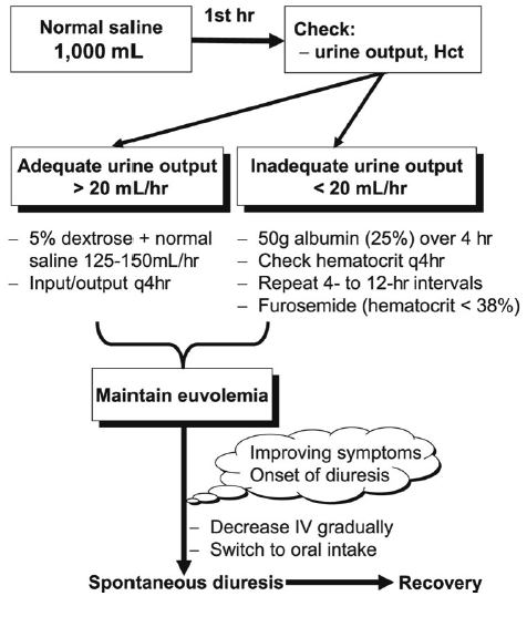 While the disease progression can be rapid, it is self-limited. Management should be centered on monitoring for progression of symptoms and supportive care, i.e. appropriate hydration and pain management. During this time patients are encouraged to limit physical activity to reduce risk of rupture and ovarian torsion. In the rare event patients progress to severe organ dysfunction, hospitalization will be required and the goal transitions to prevention of decline. This will require careful maintenance of hemodynamics, avoiding extremes such as hemoconcentration.